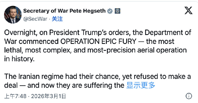 赫格塞斯在社交平臺X發(fā)文稱,施美實現(xiàn)在美國與以色列聯(lián)合發(fā)動襲擊后,軍已伊朗發(fā)起反擊行動,全面美方 “絕不會容忍針對美國人的放開強力導彈”。